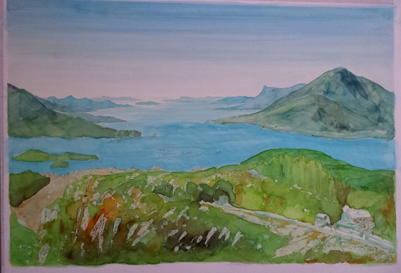 これは瀬戸内の「しまなみ海道」沿いの島々を描いたもので、まだ製作途中です、ちょうど海を塗ったところですが、どうも薄い色過ぎて、なんとなく落ち着きませんね。もっと海の色を深くすると全体として落ち着くかな?と考えているところです。薄いブルーの部分はゴムを塗りつけている箇所で、後で剥がして白く残すためのものです。